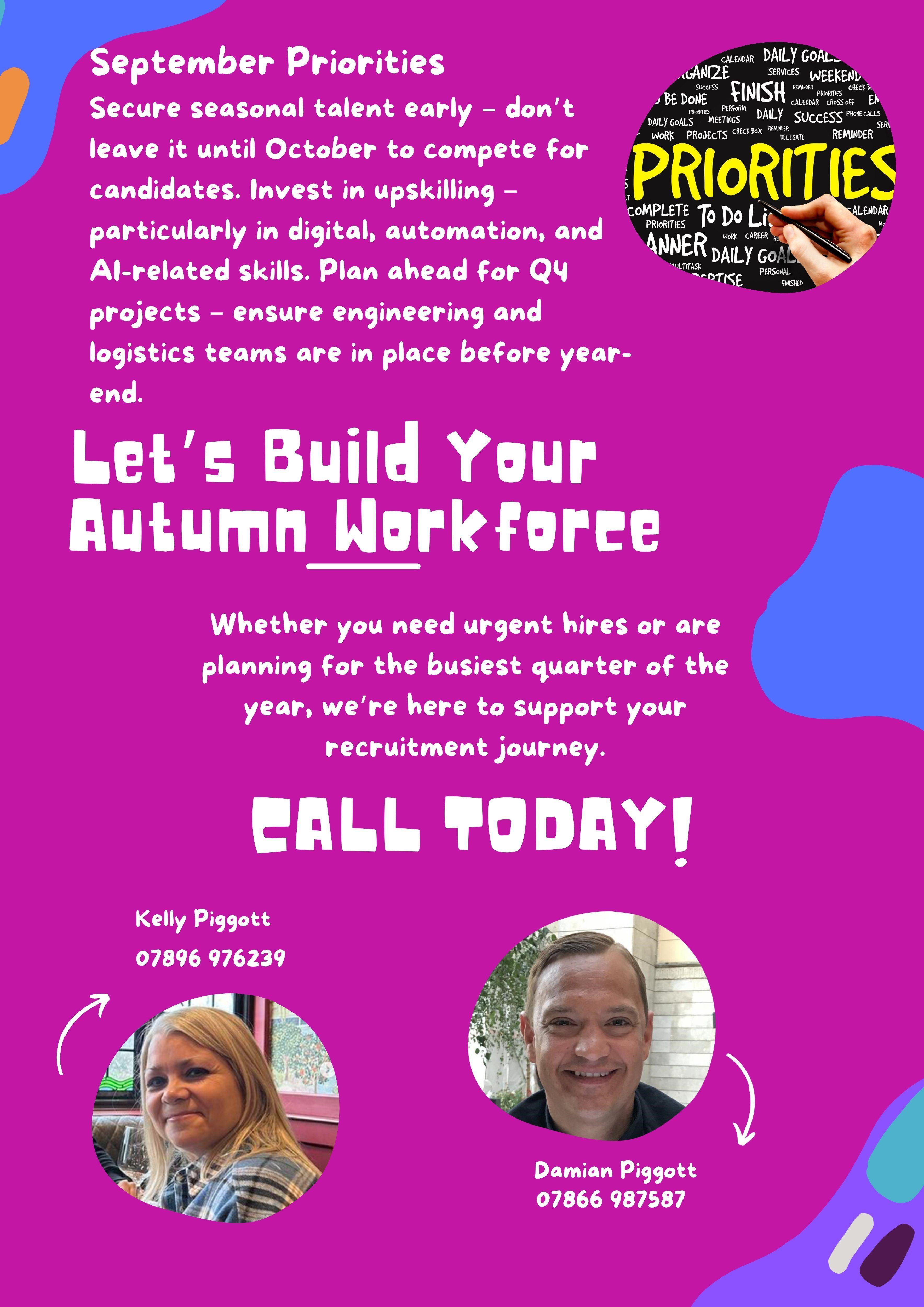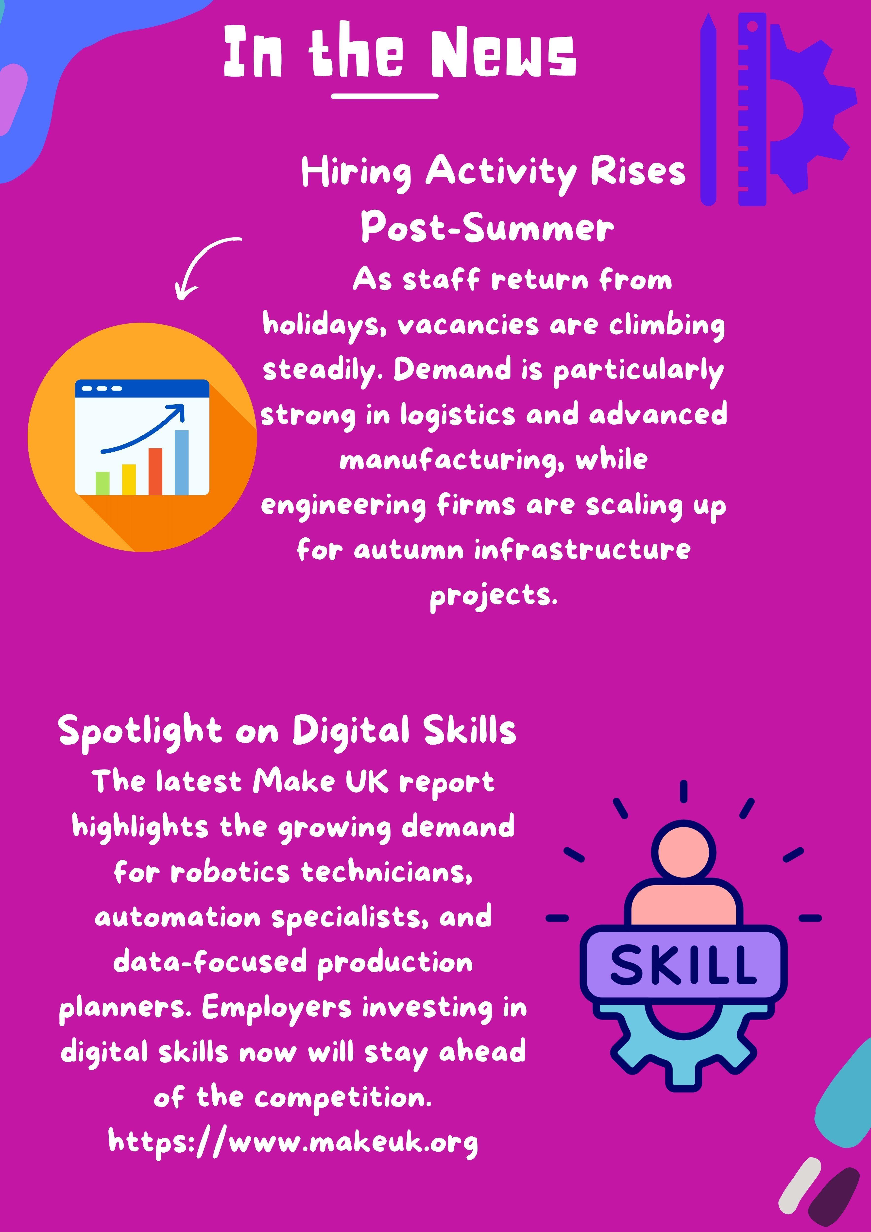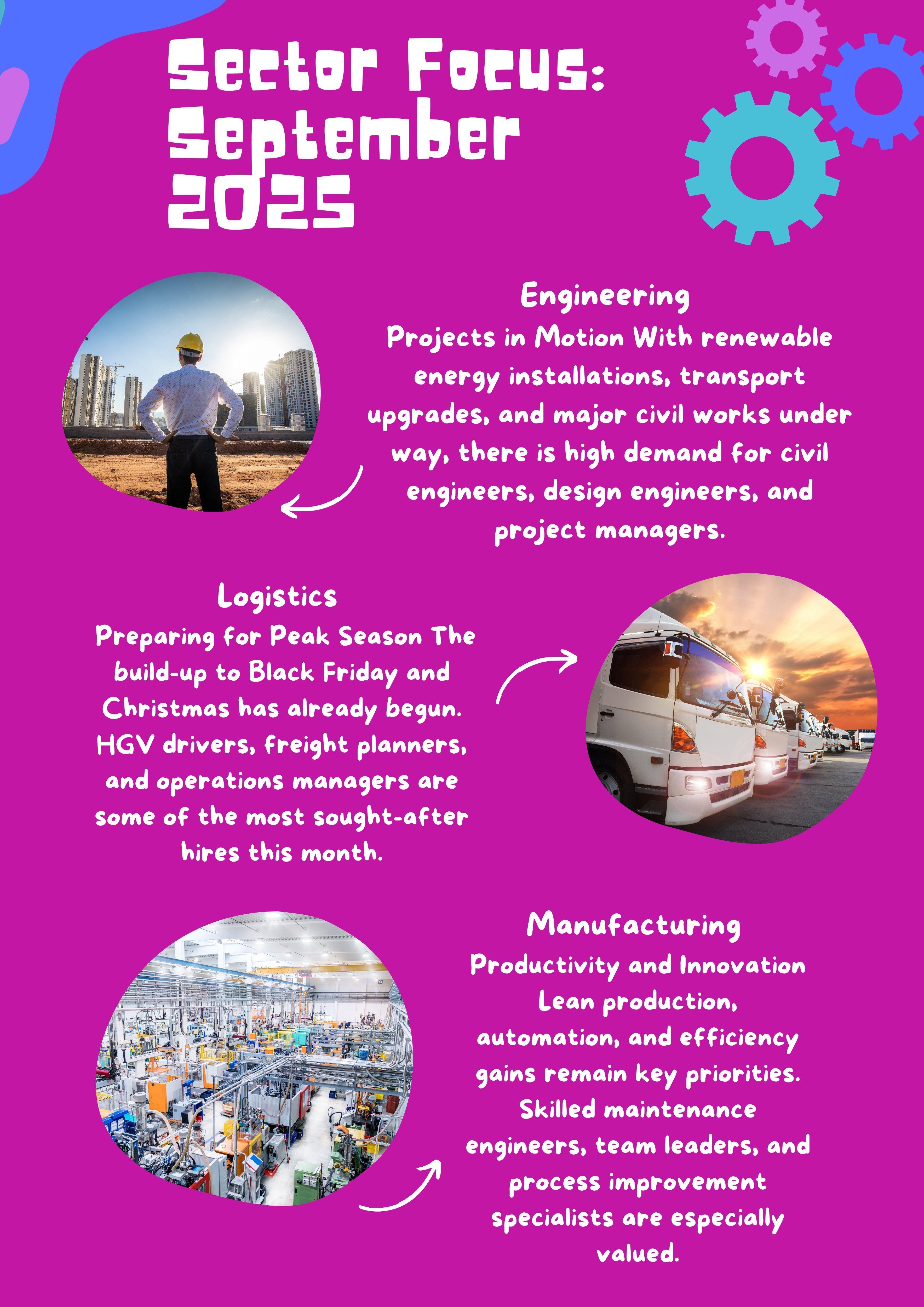 Hello September! With summer behind us, hiring across engineering, logistics, and manufacturing is stepping up a gear. September is one of the busiest periods of the year, as businesses look to secure talent ahead of the end-of-year rush. If you’ve been holding off, now is the perfect time to act.